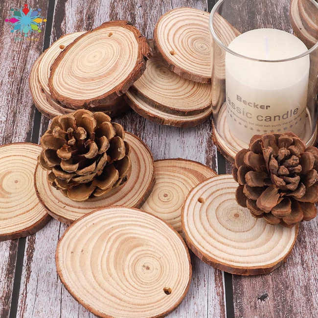 Each wood slice is made of natural pine wood with bark.